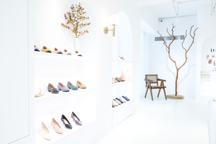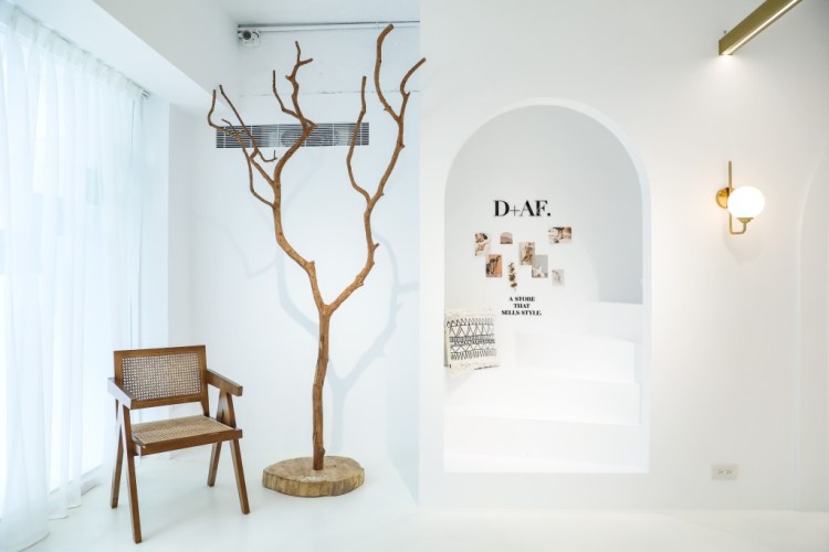 D+AF首間品牌體驗店以設計理念「less is more」為概念,打造女孩最愛的隱藏版仙境「全台最美鞋店」,減少鞋子陳列數量及擺設,利用自然光線放大整體空間感,以白色為基調的時尚空間,營造出輕鬆愜意的購物氛圍。純白半圓型夢幻拱門設計、天花橢圓燈架、不規則形訂製全身鏡,及讓商品一目了然的梯田式陳列鞋架,在四方的空間刻劃出層次豐富的圓弧線條。擺設方面運用枯木元素,以原材的柔和顏色及天然紋理質感,展示質樸的原始之美,顛覆既有想像,體驗沉浸式生活美學,夢幻氣息讓人彷彿置身異國。