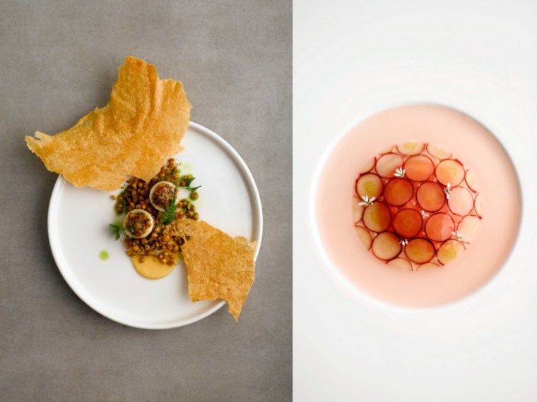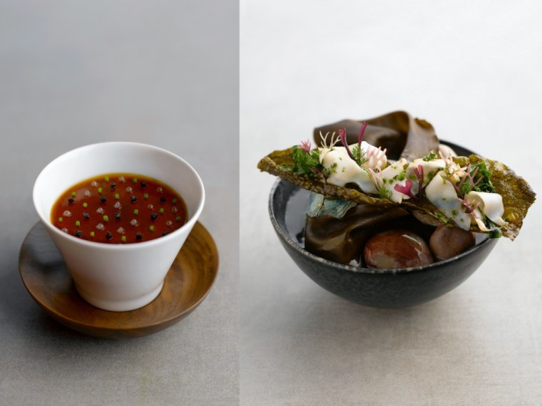 Kombu tartine海味昆布脆片:以「大海的鮮味」為味覺主角,熟成一百個小時的帆立貝搭配昆布脆片,加上油封燉檸與紫蔥花、茴香花、芫荽花的清香,在品嚐濃郁鮮味的同時也帶有清爽的香檸氣息。