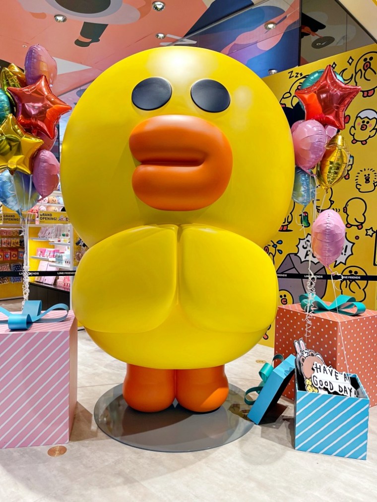 整間Line Friends商店承襲PLAY鮮黃明亮的風格,日常塗鴉設計主題風格與派對氛圍,滿版的莎莉布置整間店面,踏入大門就有高達250公分的超萌巨無霸莎莉迎接,現場還準備了熊大、兔兔與莎莉的氣球、禮物盒裝置及手拿牌,讓粉絲們可以打卡拍照。