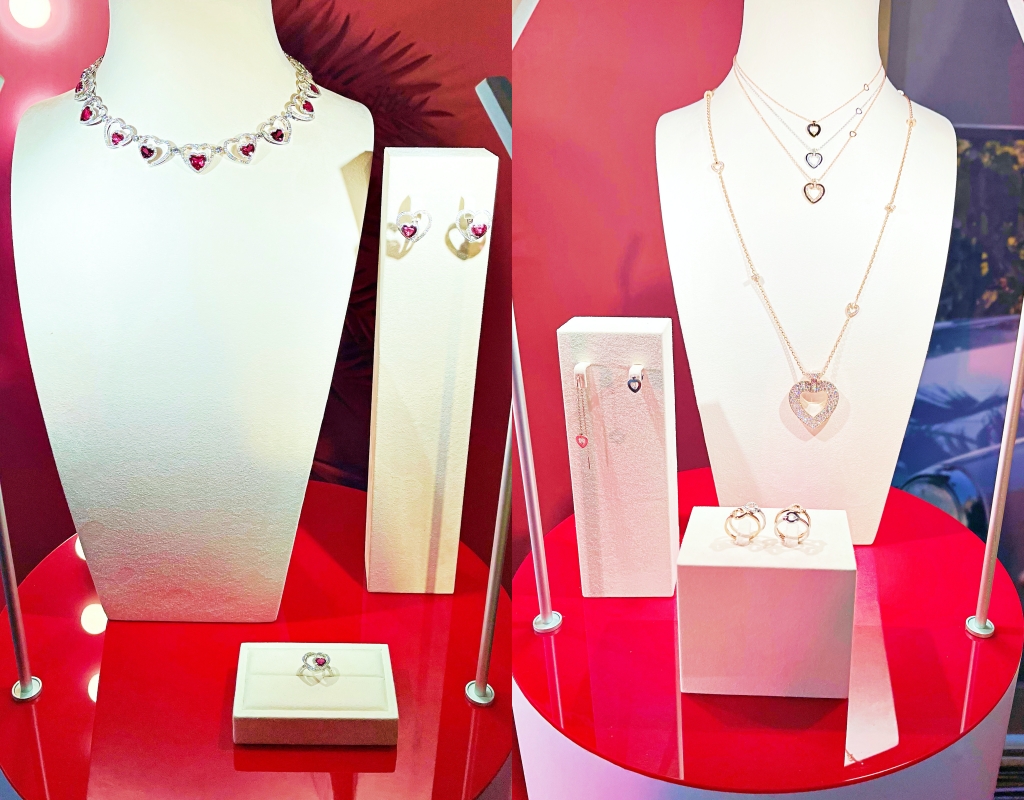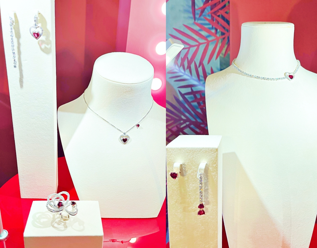 主打的「Audacious」項鍊以精妙設計結合高超技藝將6件珠寶合而為一,不對稱設計的心形鑲鑽吊墜裝有8顆環繞鑽石的心形紅色碧璽,由554顆共重20克拉的鑽石與8顆共14克拉重的心形紅色碧璽組成,其中7個吊墜可以拆卸,組合為耳環、胸針、鎖鍊式項鍊等不同部位的珠寶佩戴,展現多變的佩戴方式。