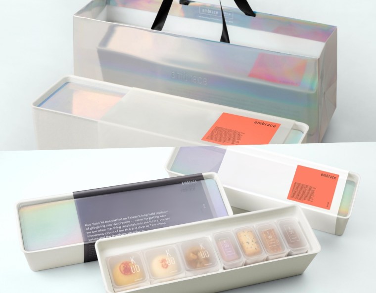 「我喜歡做很酷的東西。這次的設計是前衛潮流風格,有別於5年前的文青時尚感,充滿設計感又有性格。」潮流設計師聶永真表示。透過聶永真操刀,「郭元益X聶永真155周年紀念禮盒embrace」外盒設計跳脫既有喜餅框架,長形深盒裝盛雙層糕餅點心,優雅而份量感十足,包裝材質選用喜餅少見的白色紙漿模作為糕點盛器,觸感質樸溫厚,搭配現代感十足的雷射虹彩外包紙,開盒後依光線角度映出不同炫麗色彩,打造最想擁有的時尚夢幻訂製喜餅禮盒,為各種形式愛情都能找到傳達心意的最美選擇,也為送禮的人獻上最美致意。