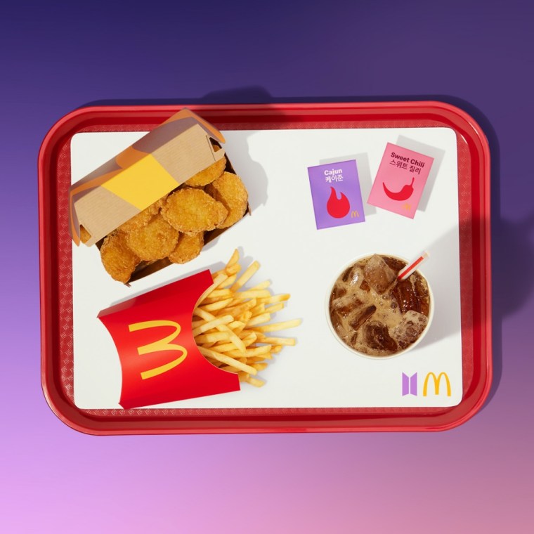 BTS防彈少年團最愛的麥當勞聯名套餐組「THE BTS MEAL」,以BTS的紫色及LOGO作套餐包裝設計,內容包含大家都常吃的10塊麥克鷄塊、中份薯條、中杯冷飲,搭配韓國直送的「甜辣醬」與「肯瓊醬」2款全新特殊口味的辣醬,經典的醣醋醬也同時提供,可依個人喜好選擇2款。