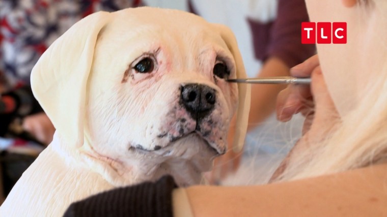 奧斯丁的動物救助協會訂蛋糕當作年度慈善活動的抽獎獎項以籌募協會資金。娜塔莉與戴維決定以毛小孩羅賓森太太當蛋糕的靈感。這個小狗蛋糕成品約30公分高,香草搭配香草奶油糖霜口味,頭部與腿部則是用米香製作成形,用食用色素在塑形巧克力與翻糖製成的蛋糕表面塗上各種小細節讓蛋糕如栩栩如生的小狗,最後在鼻子及眼球塗鏡面果膠創造出明亮與濕潤感,「跟羅賓森太太小時候非常像!」客戶也驚喜地無法自拔:「太可愛了,我原本以為會是蛋糕上放狗狗裝飾,沒想到會是栩栩如生的一隻狗,牠搞不好還會親我們呢!」狗狗蛋糕大獲好評,娜塔莉如釋重負,「我們因此睡眠不足,但也值得了!」