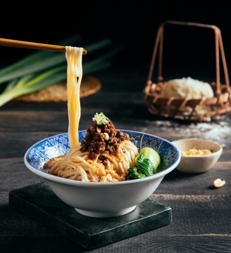 林口亞昕福朋喜來登酒店聚味軒中餐聽主廚特製「牛肉擔擔麵」,改良自傳統四川小吃擔擔麵,將乾蔥、蒜與老薑及自製豉椒醬,小火炒香後放入老滷製成的牛肉丁,與杏鮑菇及獨門香辛料一同拌炒,搭配秘制醬汁與胡麻醬,拌入特選拉麵條,香而不膩,辣而不嗆好吃到停不下筷子。