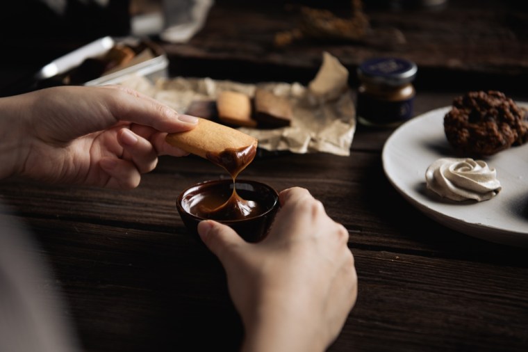 傳統葉片狀的「丸⼤⾖醬油千層酥」,選用日本產丸⼤⾖釀造醬油,天然無添加的鹹鮮,融入些許⿊糖與柑橘的清新酸,鹹中帶甜的風味、層層折疊千層⽪的酥脆感,讓奶油香氣能輕易在⼝中散發。今年特別開發的新口味榛果醬,是經由多種口味中票選出來,獨特的風味及口感,保證一吃就上癮!