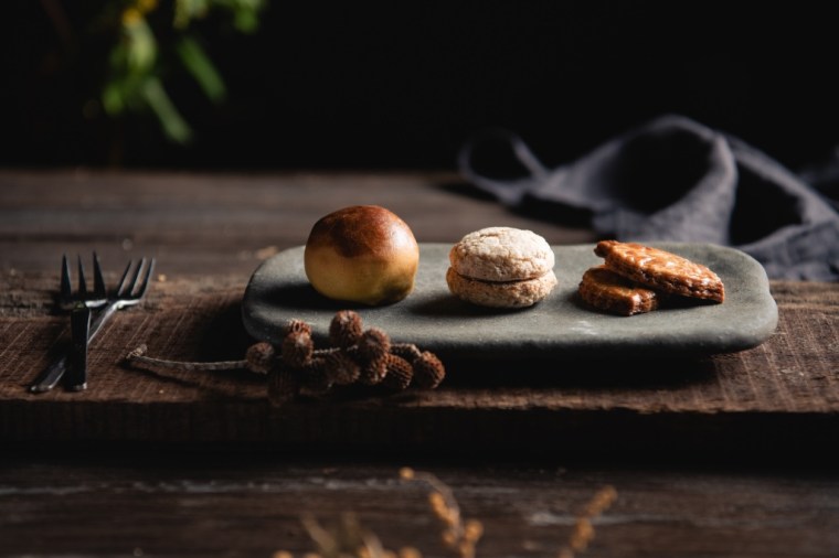 「花⽣杏仁餅」 以嘉義東⽯鄉⼩農花⽣與沖繩的島砂糖,融合杏仁膏製成⼝感緊實的軟餅乾,濃厚的花生原味在島砂糖的提韻下更加鮮明,帶來樸實卻深刻的味蕾體驗。「鹹蛋黃擂茶燒」基底為客家擂茶的茶香、堅果香,與噴附⽇本清酒微⽢的綿密⼿⼯鹹蛋黃,⼀同包覆進⽇式燒菓⼦外⽪,加入西西⾥開⼼果碎餡,融合茶香、清酒甘甜及堅果韻味,刷新味覺多元的想像空間。