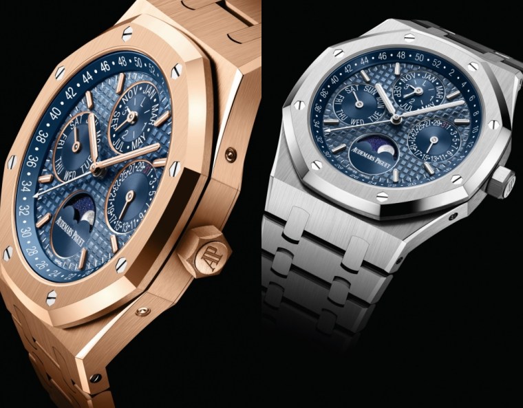 瑞士頂級鐘錶Audemars Piguet愛彼(AP)皇家橡樹萬年曆腕錶全新錶款,備有18K玫瑰金及手工精修裝飾精鋼2款,錶面巧妙結合原創皇家橡樹腕錶的經典藍色等多種全新對比藍色調,用來裝飾小錶盤及內錶圈,與周遭光線互映增輝錶殼直徑41毫米,厚度僅有9.5毫米,展現纖巧身姿,2款錶殼皆經手工霧面打磨與亮面拋光交錯處理,搭配相同材質的錶帶及AP字樣折疊扣,錶殼都可與錶面的豐富藍色調相得益彰,成就個性十足的時尚造型。