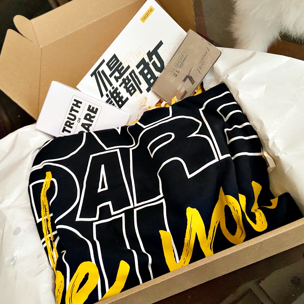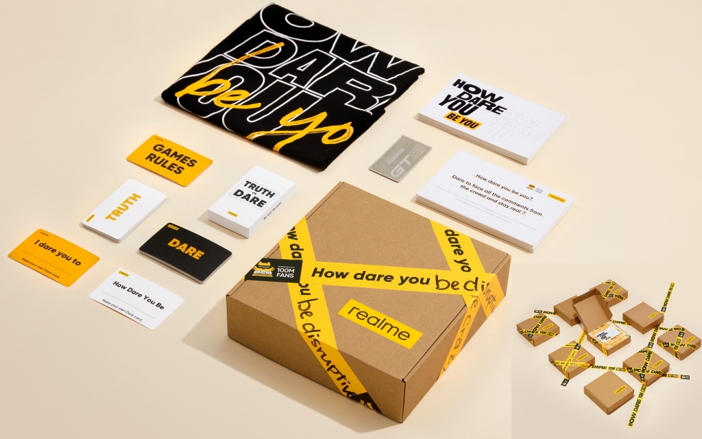 realm狂歡年度盛會粉絲節,推出限量禮盒Dare Box意謂掙脫外在束縛,透過撕除盒裝的挑釁膠帶,象徵擺脫外界質疑的糾纏,充滿儀式感的開箱過程將勇氣轉化為具體行動,再穿上限定版How Dare YouT恤,與realme一起大膽挑戰世俗規範,直球對決外界負面抨擊,無懼前行。