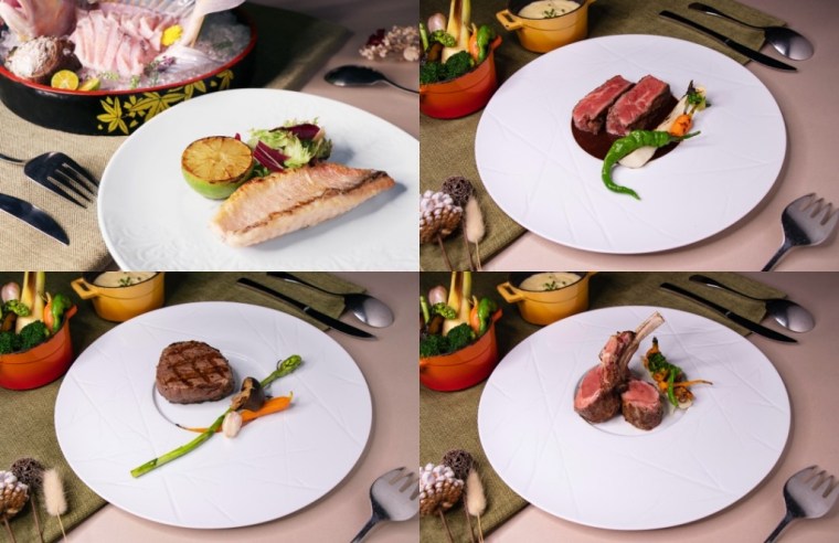 「灌木蜂蜜醬烤智利海鱸圓鱈」嚴選智利海鱸魚,經過主廚特調烤魚汁浸泡、烘烤,底層鋪上炒蛋白襯托魚肉色澤,外觀典雅,灌木蜂蜜獨有的細膩香氣,成為海鮮料理的靈魂。「風乾果香山葵金棗蝦球」將酥炸蝦球透過盛產水果製作的果乾點綴,拌入日式山葵沙拉醬,營造新意。