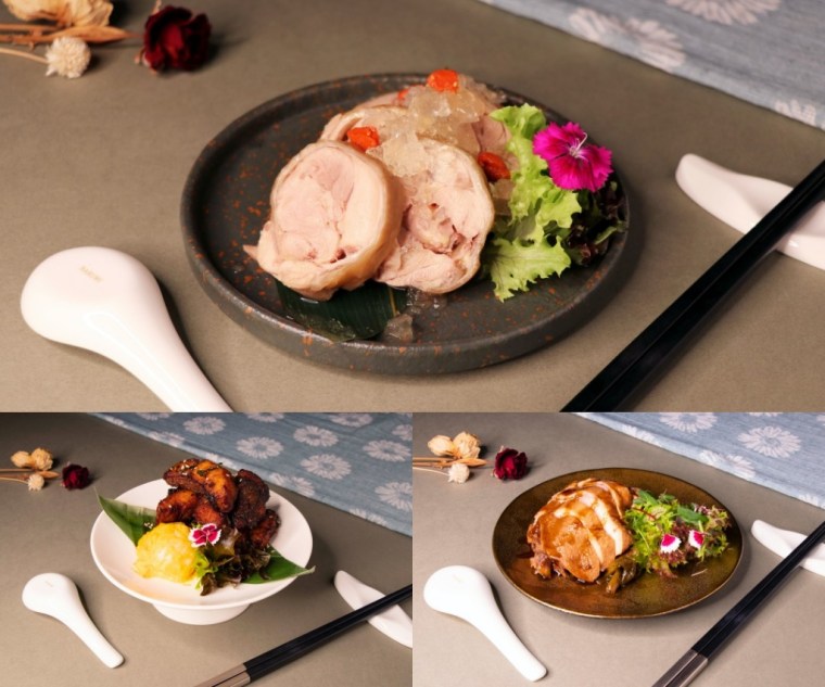 精緻餐前小點「冰鎮愛玉玫瑰露醉雞」,用巴西蘑菇湯清蒸仿土雞腿肉,浸泡於藥膳酒中醃漬,將雞湯精華凝結成果凍狀、灑上玫瑰露,帶出微醺浪漫的視覺與風味。「新杭式燻魚佐黃金泡菜」使用冰糖加醬油調味之醬汁,包裹住經蔥、薑、酒醃過的鱸魚,佐以豆腐乳醃漬的台灣泡菜,滋味兼具鹹甜香。開胃冷盤「滬式京蔥冰糖醬鴨」以老滷汁與宜蘭蔥烹調的精華滷製鴨肉,呈現烏亮色澤、散發蔥香。