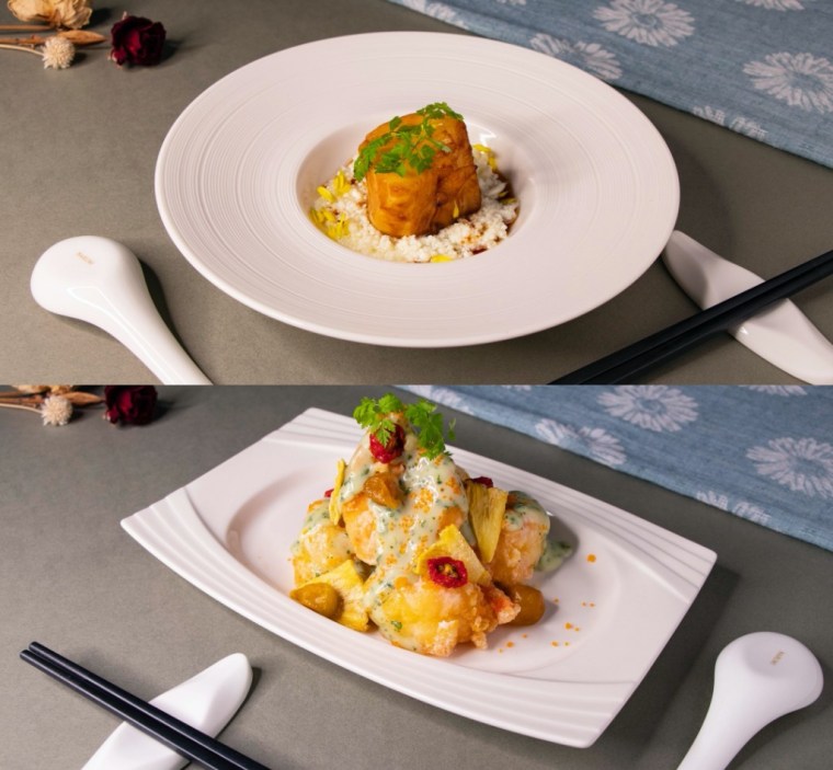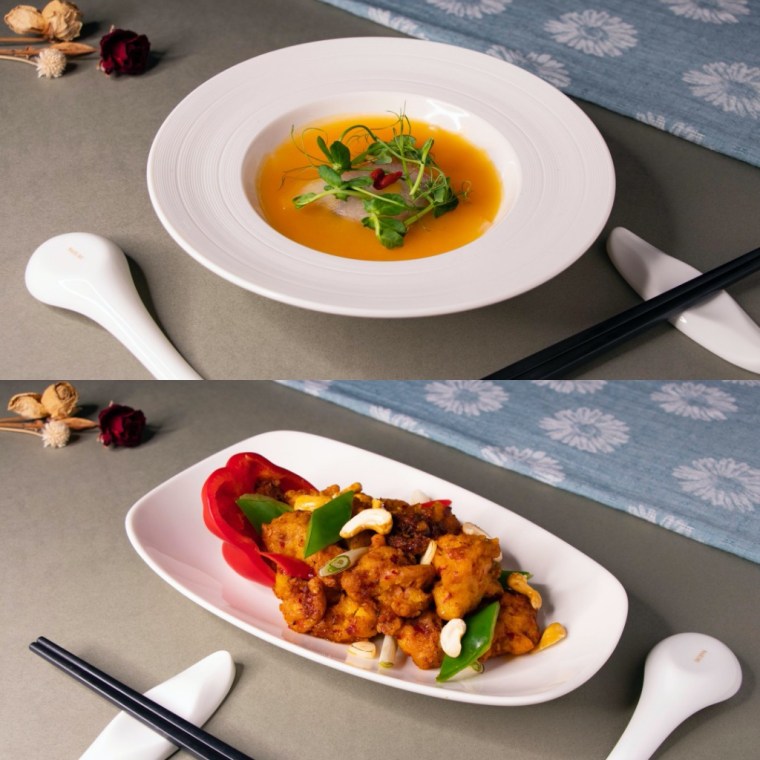 「冬瓜時蔬香米羹」在湯盤放入香菇、山藥、娃娃菜,再鋪上碧玉般透亮的冬瓜片,淋入南瓜、地瓜、紅蘿蔔熬煮的湯底,色澤溫潤、味道鮮美。「熗椒醬爆腰果雞丁」將外酥內嫩的雞丁,拌入新加坡辣椒炒蟹醬料爆香,令人吮指回味。