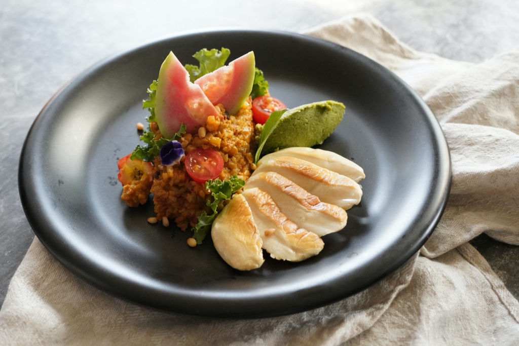針對女性十分在意的澱粉攝取,以熱量與與碳水含量極低,富含纖維質的「花椰菜米」取代精製澱粉,傾心創作「檸檬草春泥燉花椰米」。濃郁的毛豆泥佐花椰菜米燉飯,透過香茅檸檬醬汁的酸韻與檸檬香氣提升整體風味層次,搭配無毒培植的頂級「百靈菇」一起品嚐,肥厚鮮嫩的多汁口感,就算純蔬也超滿足。