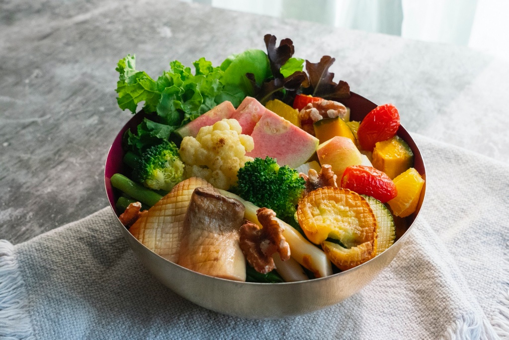 「能量蔬果盆」特選超級食物概念的時令蔬菜、當季鮮甜根莖類、綜合堅果、鮮切水果等原型食物,搭配亞麻仁油、酪梨油、橄欖油等6款超級食物鮮醇榨取的頂級油脂特調醬汁,推出以白蘭地煎烤波士頓龍蝦、伊比利豬嫩煎沙朗排、嫩煎厚片鮭魚等極選優質蛋白質打造的豪華版能量蔬果盆,追求自信與美也能盡情享受豐盛美味。
