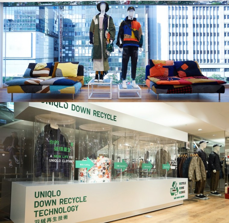 3樓「Re-UNIQLO羽絨回收流程」製程展示,宣示對在地的永續承諾。4樓知名永續設計師周裕穎以江戶時代裂織工藝,用UNIQLO二手衣打造藝術裝置、露營家具與沙發,賦予二手服裝全新生命,將永續行動融入日常生活。