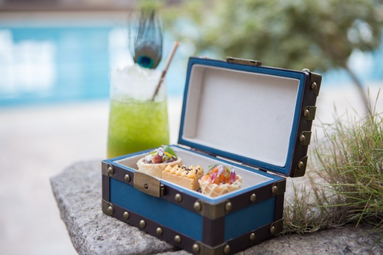 最亮眼特色的「Pavo suitcase帶你去旅行」,是Jimmy與小寶聯手打造的驚喜餐酒組合,華麗精緻的迷你旅行箱,裡頭裝著PAVO專屬特製小點,搭配小寶特別調製的「PAVO孔雀」招牌調酒,超高CP值不容錯過!