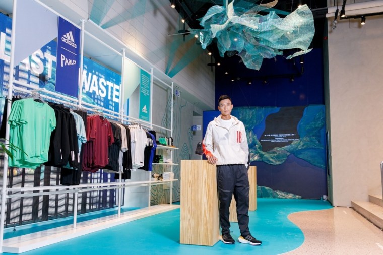 信義品牌概念店攜手台灣兩大藝術家,結合品牌精神注入獨樹一格創作能量。1樓國際藝術鬼才李霽創作以海洋環保議題為靈感出發,透過代表adidas商品的環保紗線,與代表漁業廢料的回收廢棄塑料重新排列,展示出宛如綿延河川與海浪堆疊的裝置藝術作品。