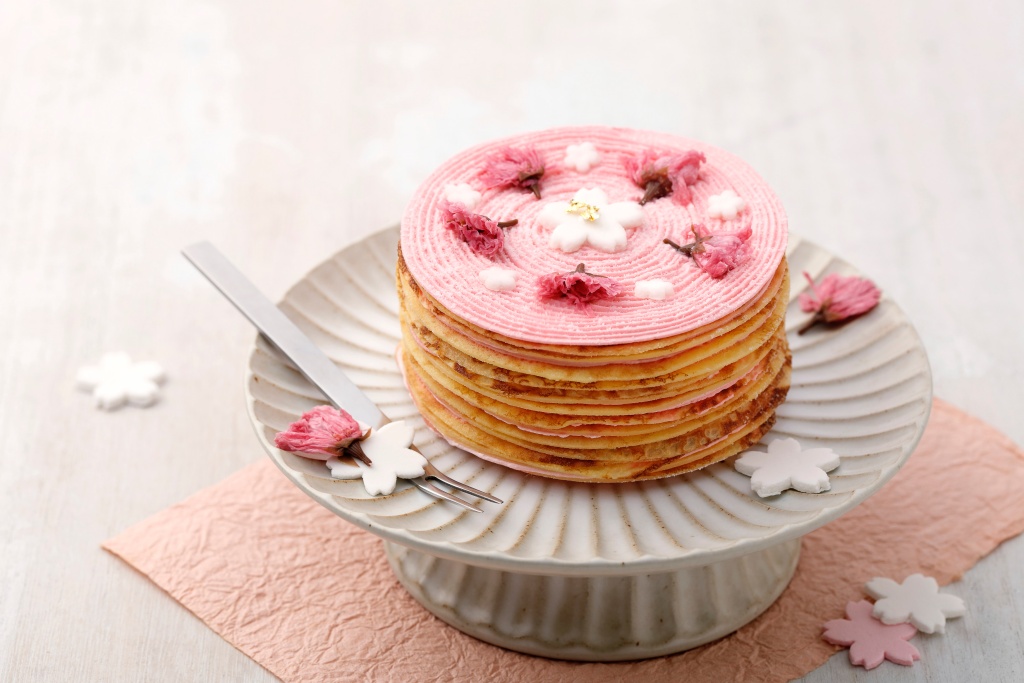春日櫻花千層採用較多雞蛋的麵糊配方,一片片以手工煎製成薄餅,層層疊上鮮奶油打發的內餡,如此反覆層疊16層,表面再以櫻花醬、櫻花香料與白豆沙等調成的櫻花豆沙餡及鹽漬櫻花等做裝飾,帶些鹹香的鹽漬櫻花清爽了味蕾。