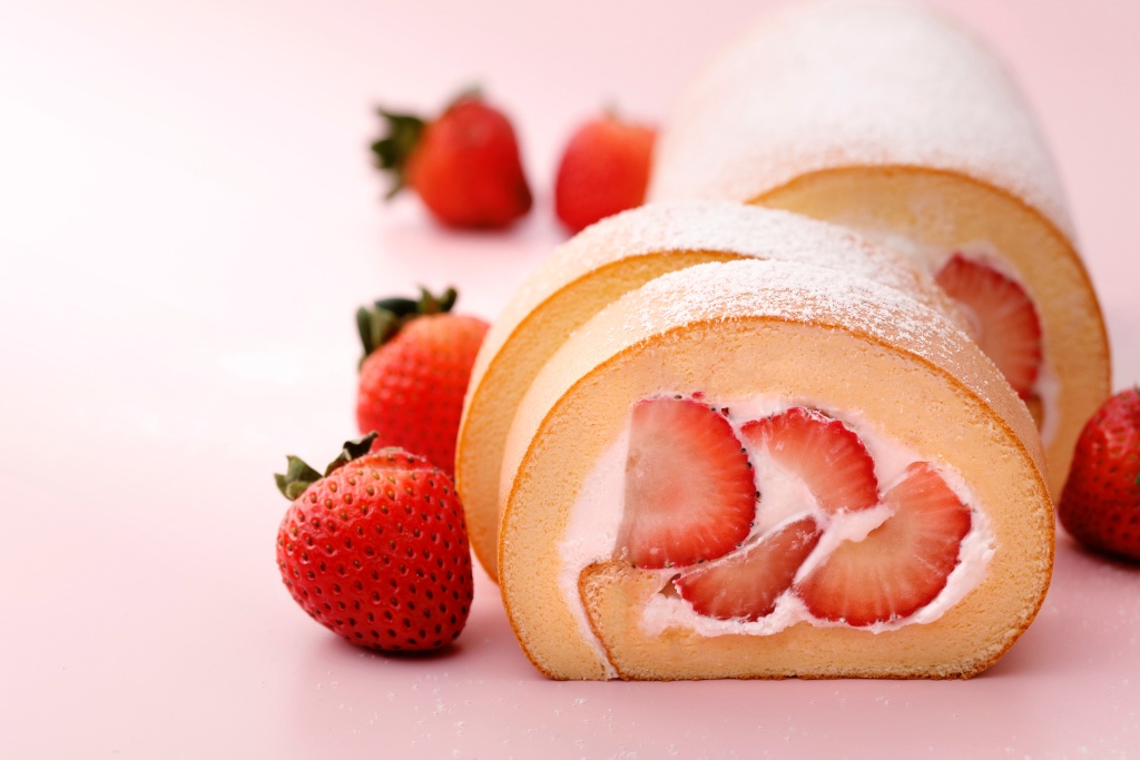 草莓生乳捲外層使用湯種蛋糕體,濕潤柔軟但仍保有彈性,包裹中澤乳霜打發的內餡之前,鋪上四排滿滿的草莓,濃郁的奶香與蛋味滿溢唇舌之間,甜美微酸的草莓增添清爽。