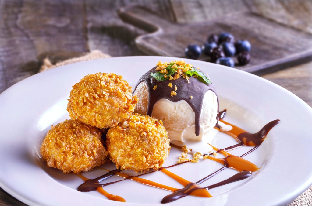轟炸起司蛋糕:把非常受歡迎的起司蛋糕裹上玉米脆片,下鍋炸至金黃,成為節慶限定專屬甜點,搭配淋上熱巧克力醬的香草冰淇淋,酥脆外表下有著綿密的起司口感顛覆味蕾。