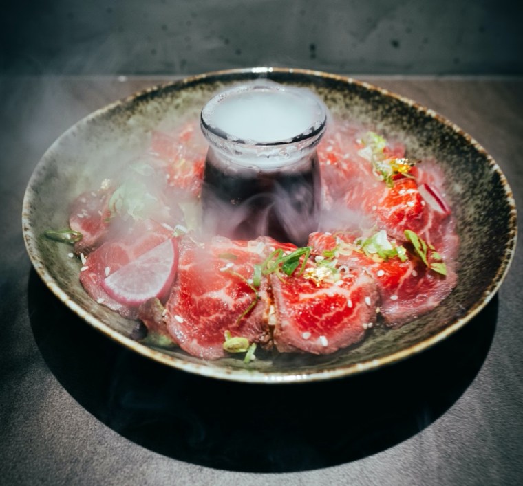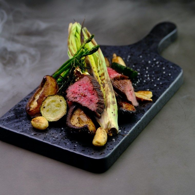 招牌炙烤牛小排與季節時蔬,牛小排在主廚嚴格溫控下經過先煎、再烤、油淋、再度火烤,終以最能展現牛小排風味的5分熟上桌,再搭配當季盛產的蔬菜,僅以細鹽與黑胡椒調味,最後再淋上清酒引出蔬菜的甜味,適合作為晚餐時段主餐。