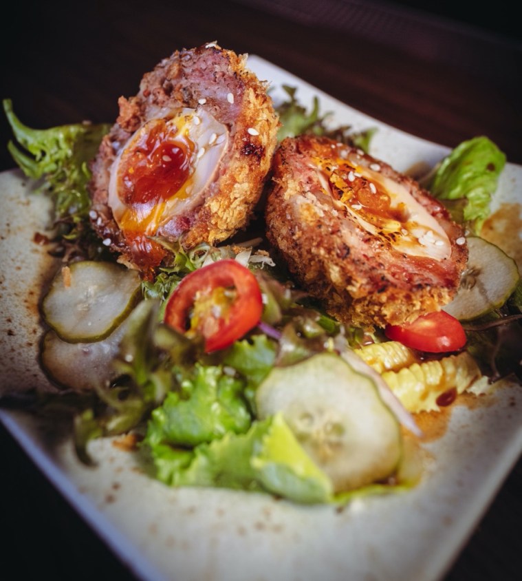 生菜豬肉捲講究爽脆口感,將生菜菜葉與菜梗分開後,以獨特包覆手法將生菜包進嚴選台灣活菌豬五花肉片中、火烤至四面金黃酥脆,上餐前再以特調橙醋調味,吃起來清爽不油膩。另一道招牌菜色蘇格蘭炸蛋,則是以台灣紅殼紅心蛋製成溏心蛋後,牛豬混合絞肉包覆在溏心蛋外側,放進炸鍋炸熟,搭配獨門醃製醃菜與特製豬皮,更添口感。