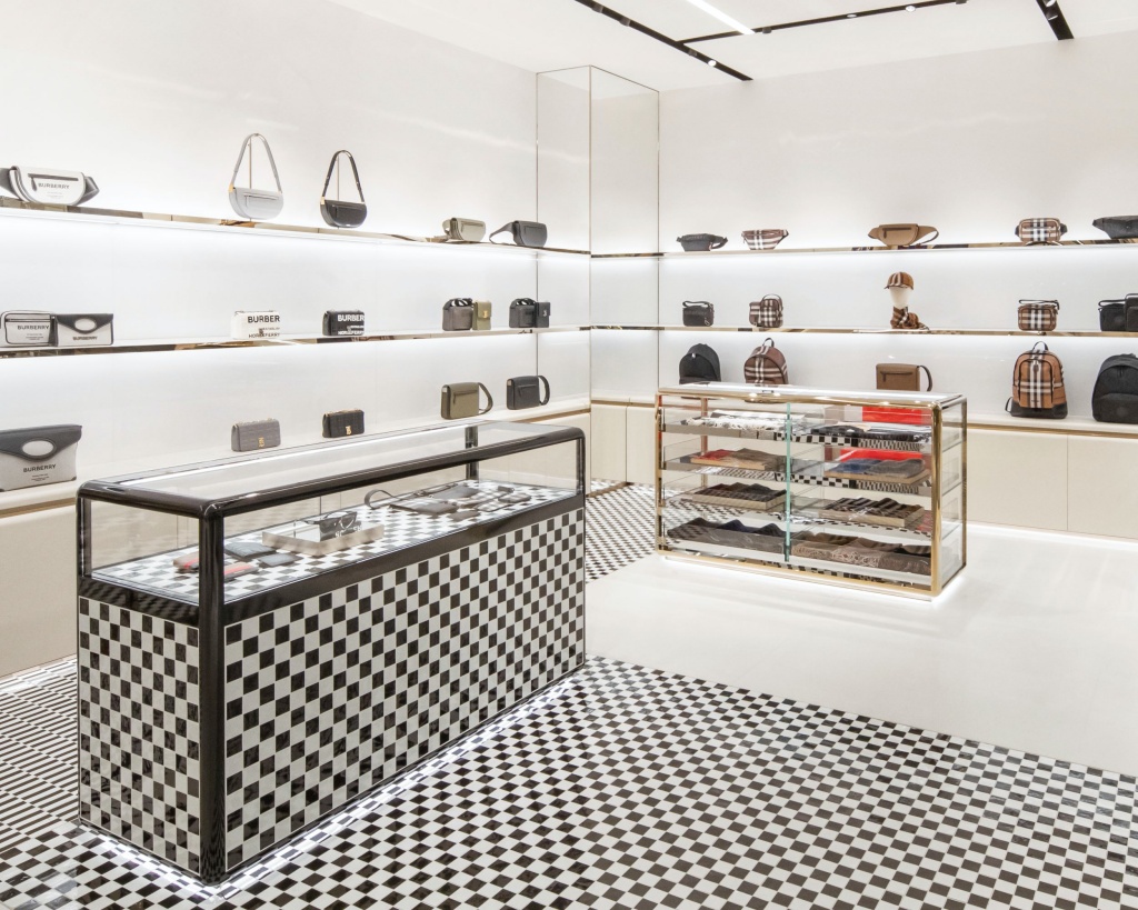 BURBERRY與著名建築師及室內設計師VINCENZO DE COTIIS(文森佐)攜手合作,發展嶄新的全球專門店設計概念,設計師跳脫窠臼、扭轉古典主義,粗曠主義元素與奢華建材並列呈現,創造出絕無僅有的現代感。店面使用Vincenzo操刀設計的陳列架、底座及獨一無二的家具,採用多種材質製成的燈飾與底座,包括水泥、陶瓷與亮面漆。經典色彩蜜金色、黑色與白色遍布整個店面,經典格紋也經過重新詮釋,融入方格天花板,藉由鏡面倒映出遍布店面的格紋磁磚地板,打造空間開放的效果。