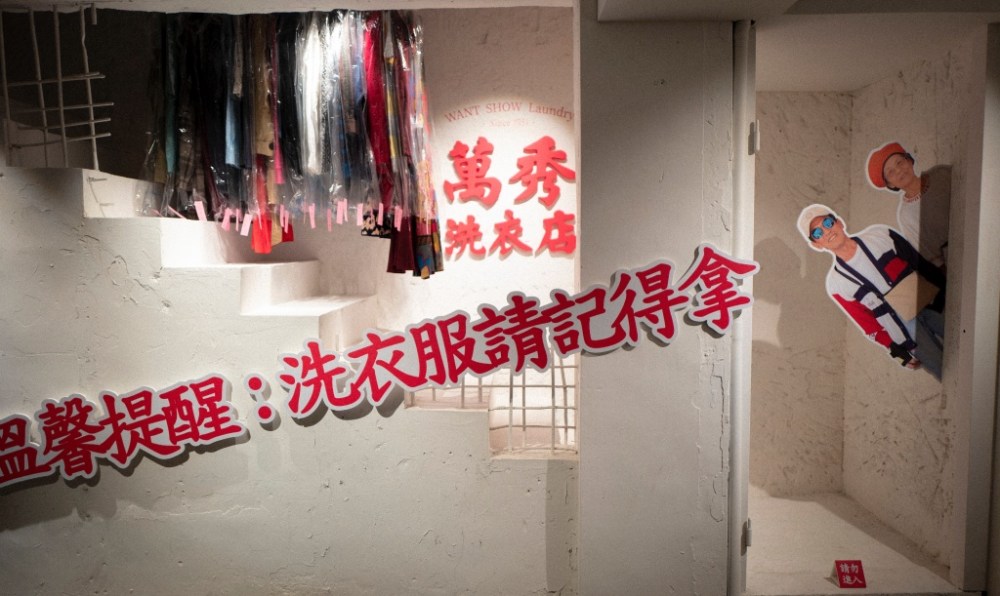 地下展覽空間除了攝影作品,也有裝置作品營造傳統洗衣店抬頭就可以看到吊滿客人衣褲的空間氛圍,溫馨提醒客人:洗衣服請記得拿!的永續概念。還有巨型的台灣傳統街景照,搭配不同時代的台式音樂,步入空間的瞬間就陷入熟悉的回憶中,體驗一個不曾想像,有愛、有故事的咖啡時光。