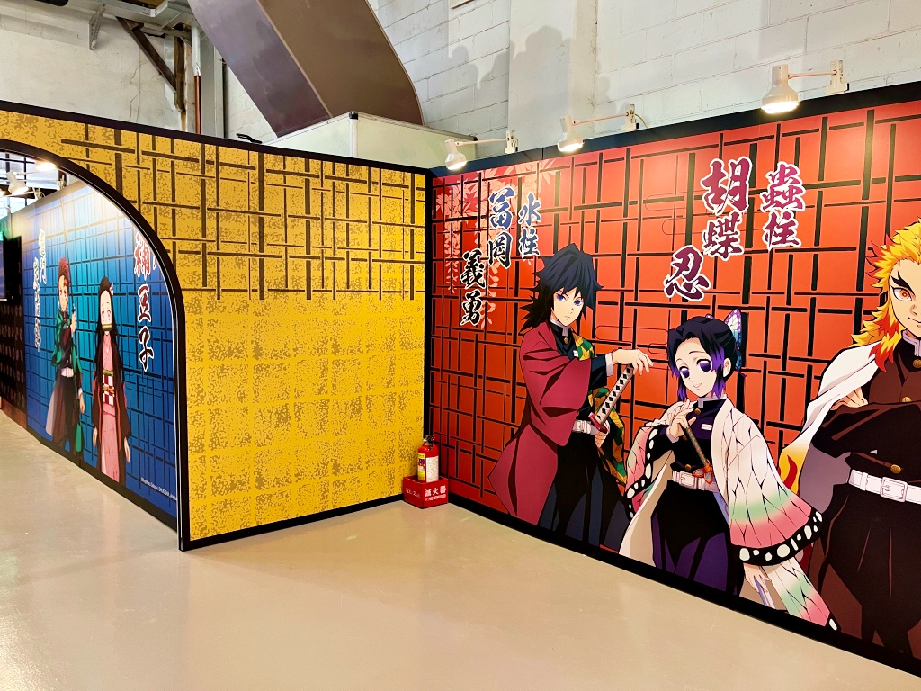 進場內四大角色及九柱的帥氣角色隧道霸氣登場,穿過隧道就能看見日式屋台造型櫃檯,四周環繞掛著經典場景畫作的和式拉門牆,沿路能看見超萌的Q版禰豆子及炭治郎3米高氣偶與九柱拍照牆,就是要讓粉絲們從入口到出口一直拍不停!