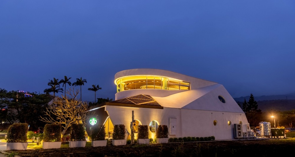 以白色鏤空鋼板牆包覆紫檀木,也為星巴克首間以永生花材馴鹿苔蘚點綴成藝術牆面的「台南佳里門市」,獨特的綠意建築外觀,更獲得2021年台南市民間公共建築景觀組建築園冶獎大獎。