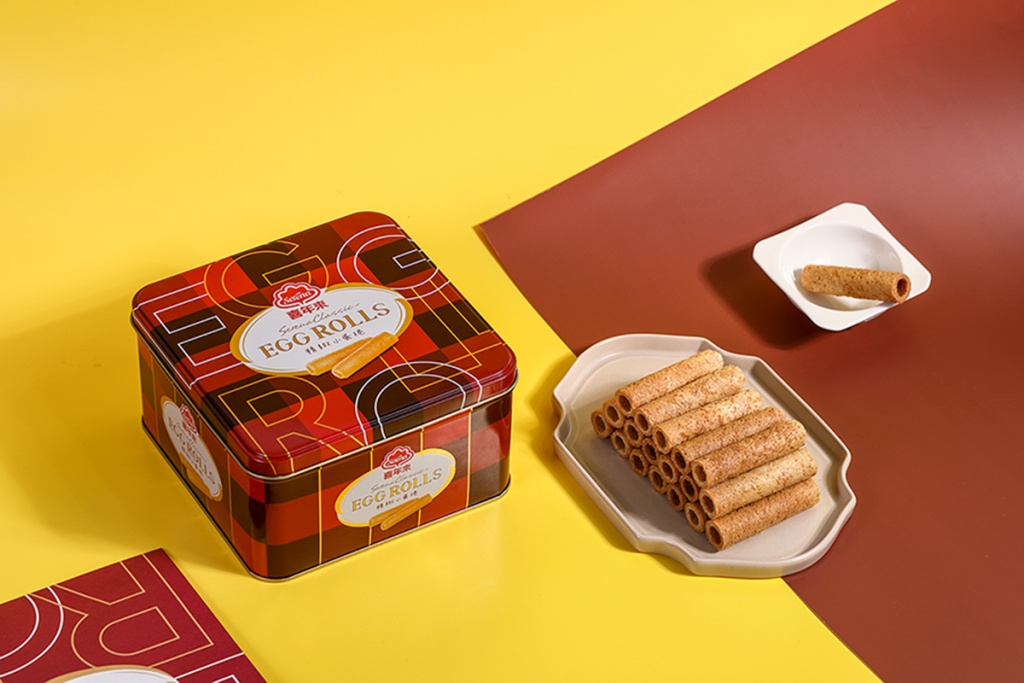 喜年來經典熱銷款Top1是客家花布設計提盒「原味蛋捲禮盒」與「精緻小蛋捲禮盒」,復刻版裸裝包裝精緻小蛋捲禮盒更是每年春節限定推出就秒殺,喜年來大方地將蛋捲頭尾截掉,長度約一般蛋捲1/2,厚實的口感,經典不變的美味,每口都吃到濃郁蛋香,完全征服饕客挑剔味蕾。
