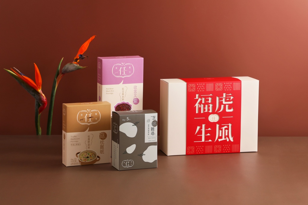 福虎生風年節禮盒包裝別具巧思,看得見Selina對於設計美學的堅持,強力推薦:「包裝設計我很喜歡,有非常多小細節,像是鏤空的福虎生風文字、窗花的燙金花紋,打開後也能看到精心搭配的緞帶及燙金LOGO,連紙袋都是一組的非常喜氣!新年禮盒有適合長輩吃的營養粥品,也有適合女性喝的減糖飲品,春節期間很適合帶一份禮盒,代表滿滿心意,虎大家健康!」