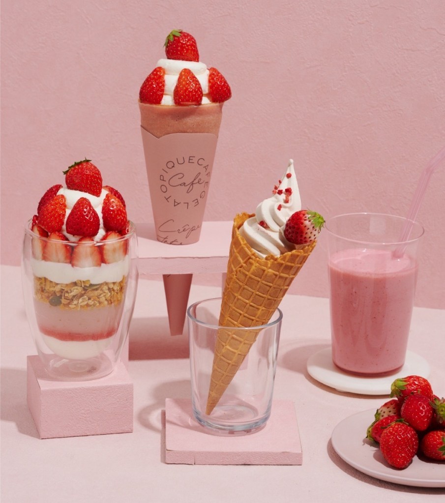 gelato pique café大量使用新鮮大湖豐香草莓,經典復刻版「草莓樂園可麗餅」連可麗餅皮都沾染草莓的粉嫩。酸甜醇厚的「草莓蜂蜜奶昔」、「草莓牛奶霜淇淋」三款濃郁系甜品交織大湖草莓的馥郁與嚴選奶香蜜甜,一年就等這一季的草莓控,每天必衝滿足味蕾!