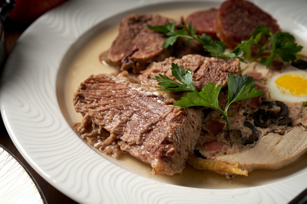 Massimo主廚循義大利風格於餐廳內為賓客提供桌邊服務。熱氣蒸騰的餐車,飄散清香的鮮甜,裊裊白煙裡是燉煮至鮮香軟嫩的「和牛舌」、「和牛前胸」,及北義傳統年菜之一「低溫煙燻豬肉香腸」,以鮮嫩豬肉與豬皮等食材製成,油脂適中,口感軟嫩,常見於冬日裡的燉煮料理。
