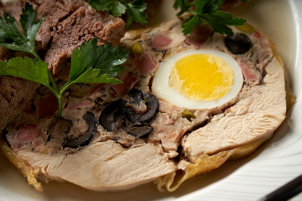 此外,主廚依循義大利傳統烹調手法,於去骨的雞肉內填塞豬肉、火腿肉、開心果、松露、風乾番茄及水煮蛋等食材製成傳統義大利手作料理「義式風味雞肉捲」,多以燉煮方式烹調,風味獨具。