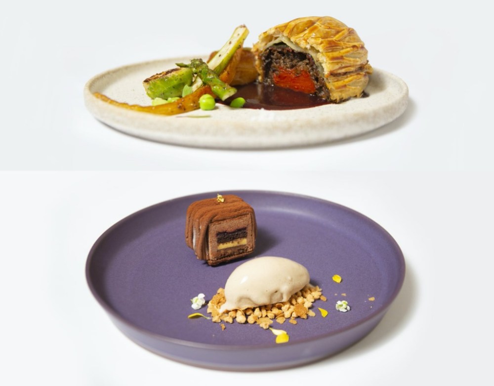 主餐「威靈頓牛排」以經典西式料理為靈感,精選多款當季蔬食入菜,取代牛肉的特殊食材是透過繁複做工反覆製作三天成型,搭佐主廚的特製醬汁,成就一道型色兼具的極品美味。另一道主餐「Encoure」主廚悉心於麵體上鋪佐松本茸、蝦荑蔥等食材增添口感及層次,以羊肚菌為主體的提味醬讓整體風味更加顯著。