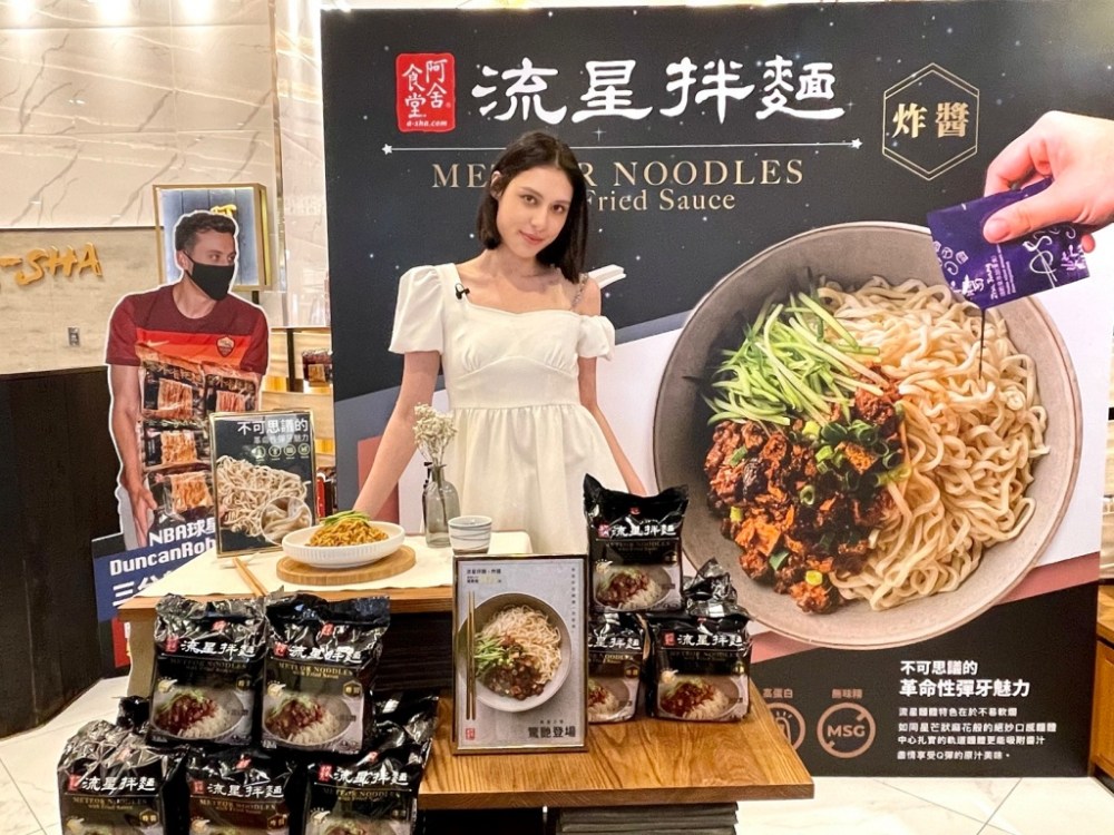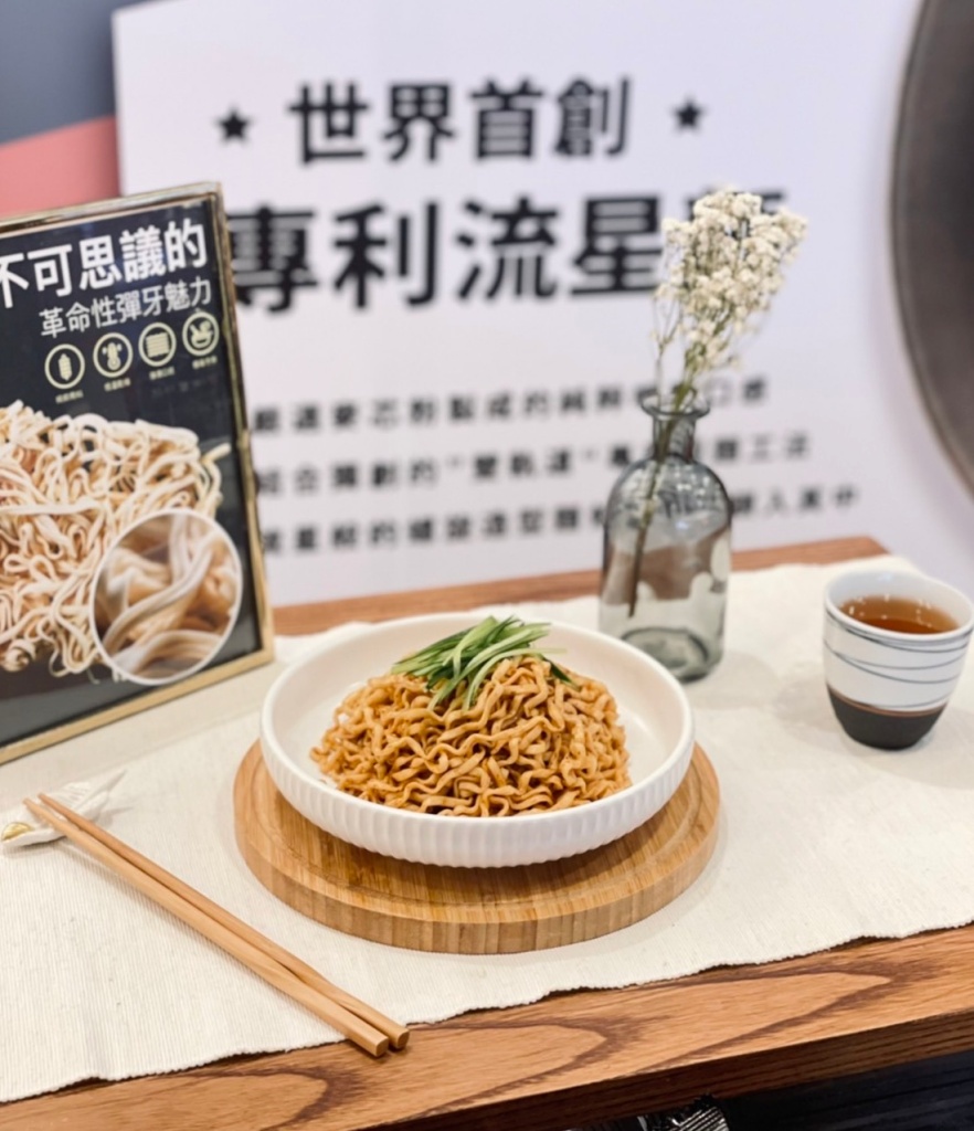 快煮麵品牌阿舍食品歷經2年的研發,首創使用專利雙軌道刀模,打造能掀起麵體革命的極致彈牙「流星麵體」,流星麵能讓麵條吸附更多醬汁,搭配先進製程製作的無MSG健康素食炸醬風味醬包,進軍葷素市場,以獨特口感搶攻炸醬老饕的味蕾。
