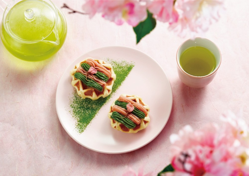 辻利茶舗首次推出外觀超可愛的比利時烈日鬆餅「抹櫻鬆餅套餐」,鬆餅麵糰常溫發酵,包覆Q彈白玉與顆粒口感的珍珠糖,點餐後當場製作新鮮現烤,剛出爐的鬆餅外皮酥脆內餡飽滿,再擠上自製的兩款白豆沙,抹茶及櫻花雙口味。