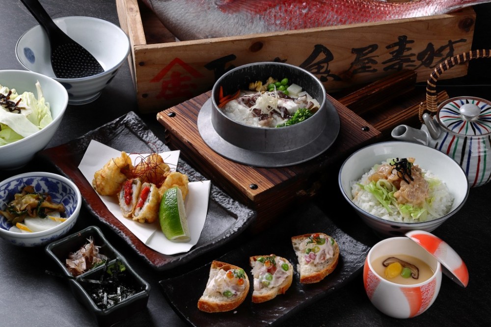 鳥丈爐端燒透過日本最具代表性的開運魚「真鯛」為主角,推出一系列多種吃法的鯛魚料理。主食推薦用料豐富,吃得到真鯛魚肉、蒟蒻條、牛蒡、青花筍、甜豆仁等食材烹煮的「真鯛釜飯」,風味清新細緻,並附有柴魚高湯可作為茶泡飯二吃享用。