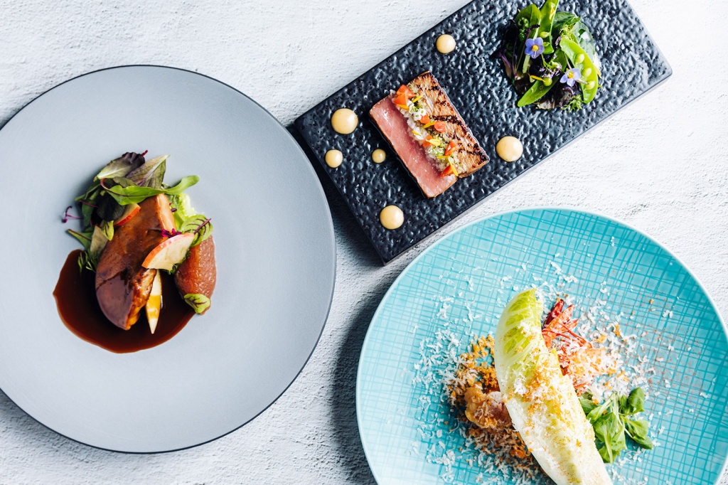 Grill Ukai西餐午晚間套餐巧妙運用虹吸壺(Syphon)吸取香氣的特性,悉心熬製「高麗人蔘雞金湯」暖心迎賓,開胃前菜提供鴨肝蔬果沙拉、鮮蝦凱薩沙拉、義式生鮪魚薄片、爐烤牛肉及鮮蝦彩漾番茄共五款沙拉,獻上繽紛豐富、如法餐般華美盤飾的多樣化選擇。