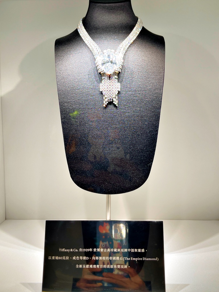 展覽重頭戲為一款價值近10億台幣,鑲嵌重逾80克拉的帝國鑽石(The Empire Diamond)高級珠寶項鍊,這是Tiffany有史以來最大的鑽石,僅次於非賣品鎮店之寶傳奇黃鑽。帝國鑽石以1顆重逾80克拉橢圓形切割成色等級D、內部無瑕的Type IIa型主鑽,重現1939年TIFFANY在世界博覽會經典的高級珠寶項鍊設計,彰顯品牌對發覺珍稀寶石的態度。