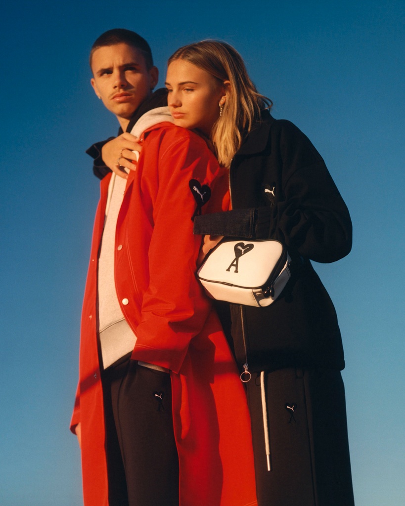 PUMA X AMI的聯名系列創作及形象廣告拍攝,皆以「幸福始於你愛的人陪伴身邊」為靈感,邀請全新年度品牌大使Romeo Beckham(David Beckham次子羅密歐貝克漢)與英國模特兒女友Mia Regan一同甜蜜入鏡,透過照片可感受到兩人之間充滿幸福粉紅泡泡,完美呼應全系列以愛為主題的設計理念。