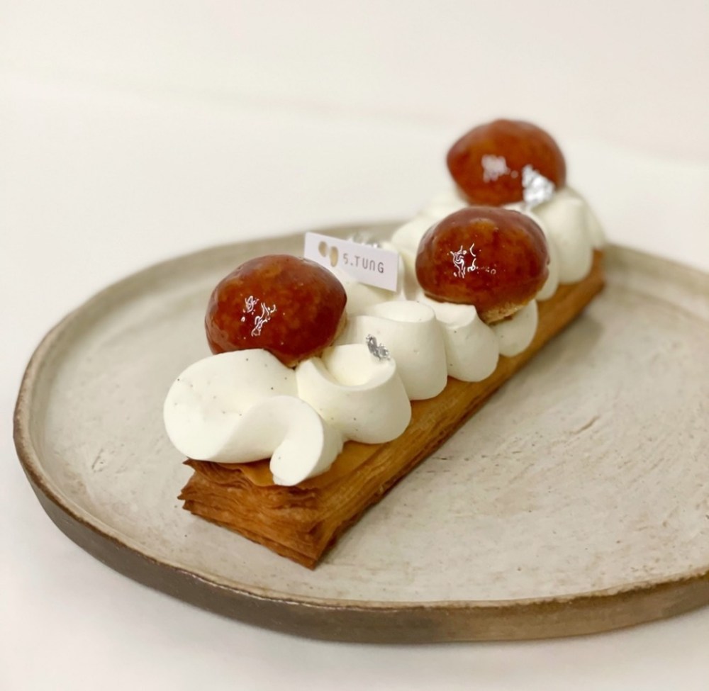 午冬甜點「艾許千層諾黑」:香氣迷人的艾許奶油製成千層酥,融入聖多諾黑的元素,艾許午冬香草千層諾黑由香草打發甘那許、海鹽焦糖、經典法式千層酥、波羅焦糖泡芙組成,海鹽焦糖與艾許奶油的香氣完美交織融合,在口中綻放出無與倫比的驚喜滋味。
