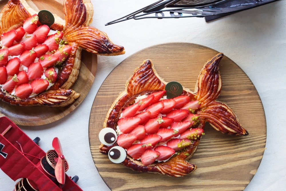 瑞莎塔烘焙坊「艾許波妞」、「艾許捲捲酥」:主廚阿戎師傅開發金魚造型模具,利用反摺法製作千層麵團,麵團底部沾上滿滿貳砂糖,讓派底增添焦糖的香氣及酥脆口感,魚身先舖西西里杏仁奶油餡,擠上煉乳風味的義大利蛋白奶油霜,再擺鱗片狀新鮮草莓,外表細長猶如辮子的捲捲酥,是經典法式甜點蝴蝶酥的變化版。