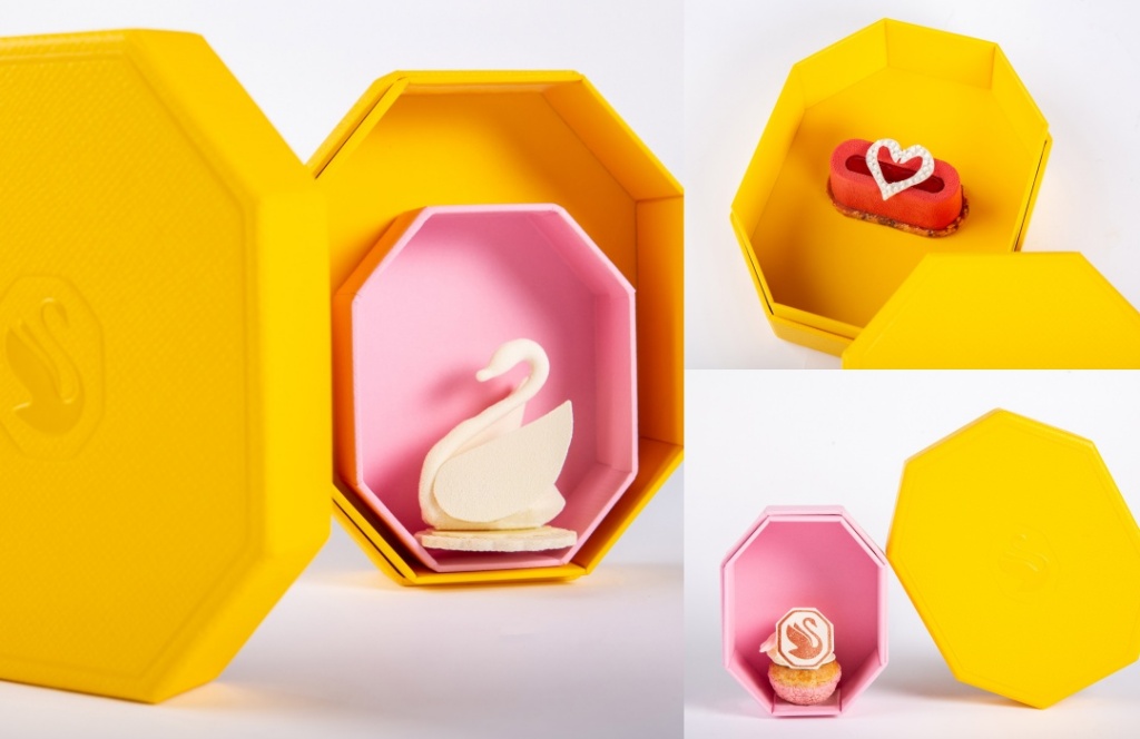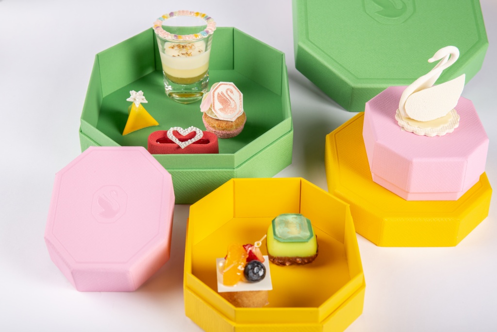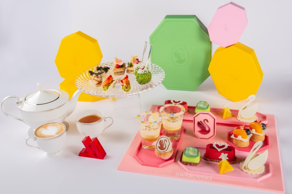 聯名下午茶以Swarovski代表著無與倫比切割工藝的全新八角形五彩繽紛包裝為靈感發想,將點心放入特製的八角形粉紅色珠寶盤中,宛如珠寶盒的下午茶除了有以代表純淨與無限可能的白色天鵝為設計靈感的點心。