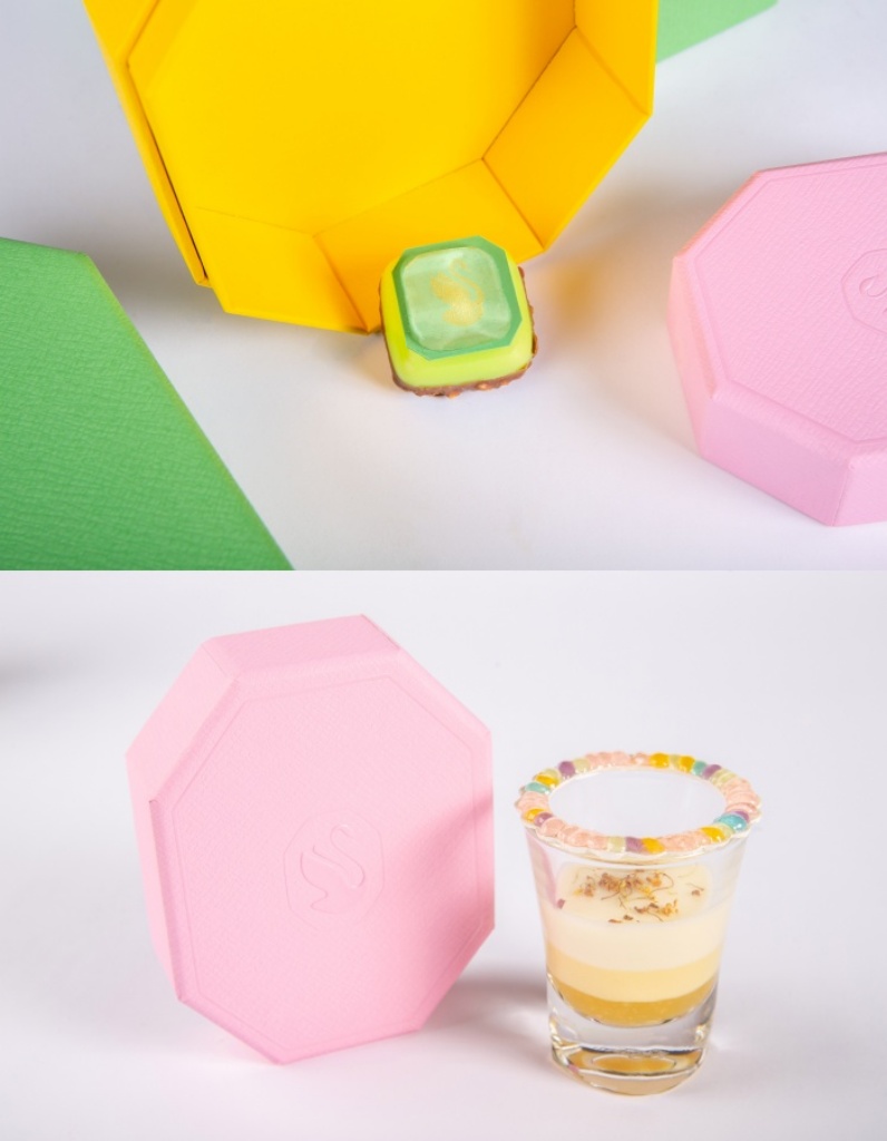造型絕美的桂花優格杯,將酸甜芬香的檸檬桂花優格填入小巧玻璃杯中,於杯口綴上一圈粉紅、粉黃、粉藍、粉綠果膠,美如彩色寶石,靈感來自施華洛世奇GEMA系列首飾。柑橘榛果黑胡椒巧克力糖將小巧金字塔巧克力填入口感微辛、酸香清爽的柑橘榛果黑胡椒內餡,頂端綴上美麗的白色五芒星,靈感來自施華洛世奇絢爛迷人的STELLA系列首飾。
