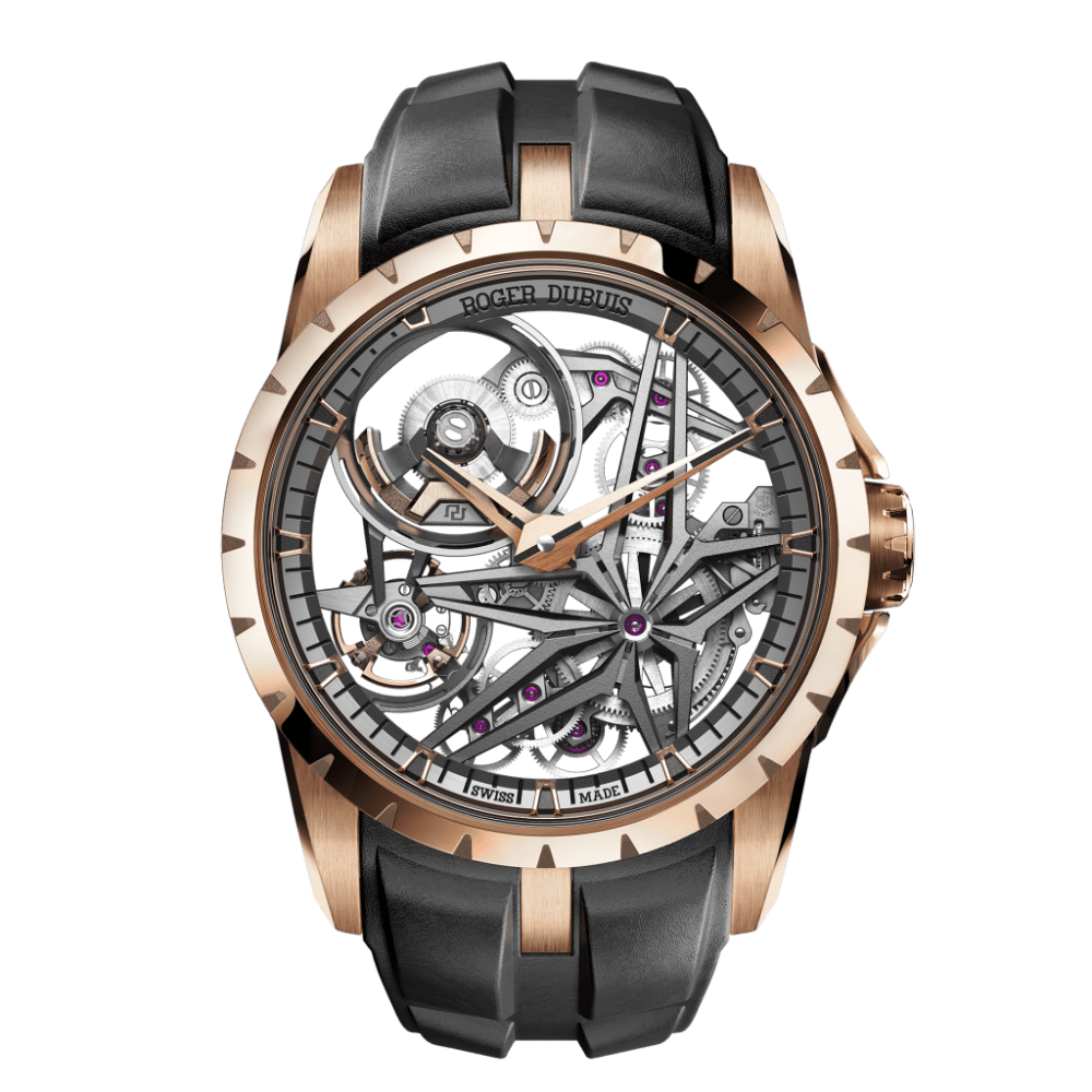經過一系列機械改良,全新問世的RD720SQ自動上鍊機芯展現極致性能,動力儲存增加至72小時。以玫瑰金與鎢精製而成的鏤空微型自動盤經改良降低震動,並蝕刻Roger Dubuis縮寫標誌,整體設計更具現代感。