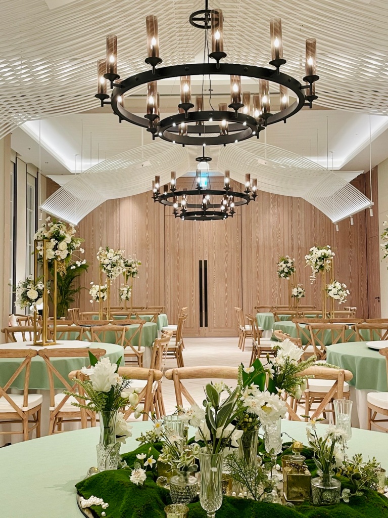 引進台中豪宅植栽元素,將建物內縮規劃出大面積落地窗的宴會廳,迎賓長廊有著木質裝置藝術「銀扇森林」與陽光自然灑落的景觀設計,在內部運用大量石材與木質軟件,搭配綠意盎然的室內植栽點綴,如同在都市中的一個宴會祕境,像是參加了一場藝廊或美術館中的時尚宴會。