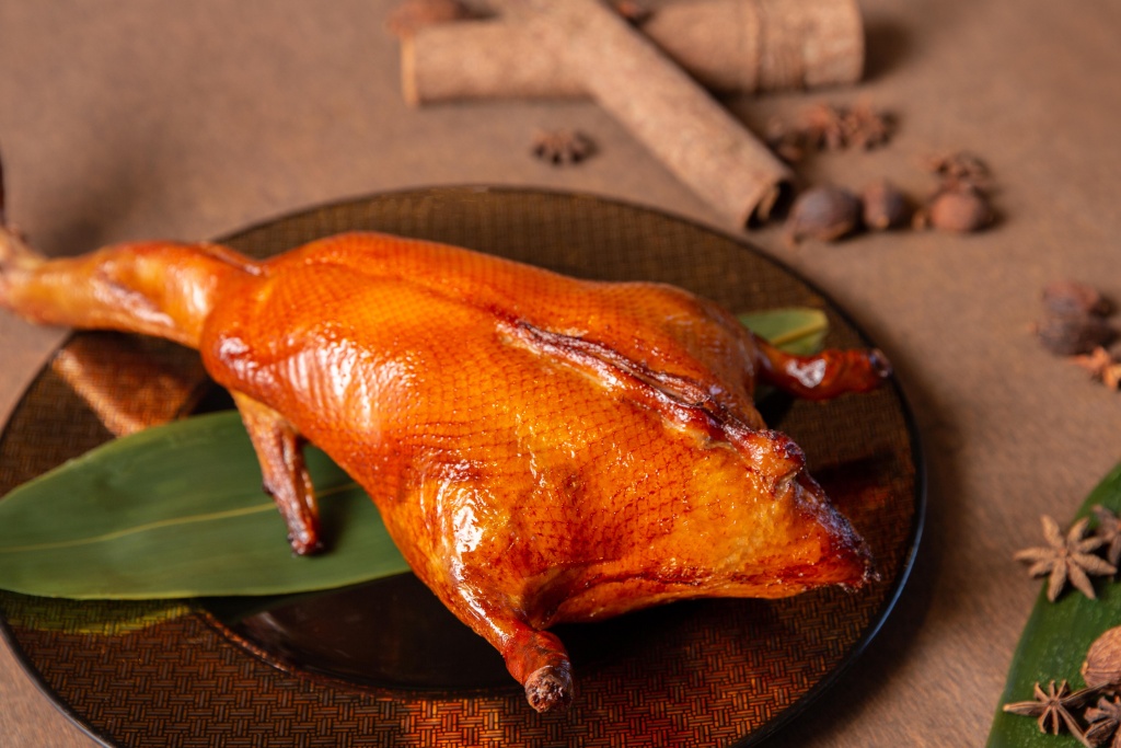做工繁複「鴨香寶粽」選用體型較小、皮脆肉嫩的整隻宜蘭櫻桃幼鴨,以特調私房醬汁及八角、草菓、桂皮等藥材醃製24小時,鴨腹填入以精熬8小時的鴨高湯拌製糯米飯、鴨肉丁,再吊起風乾12小時,入爐烤至金黃,上桌前澆淋熱油使外皮更加酥脆可口。