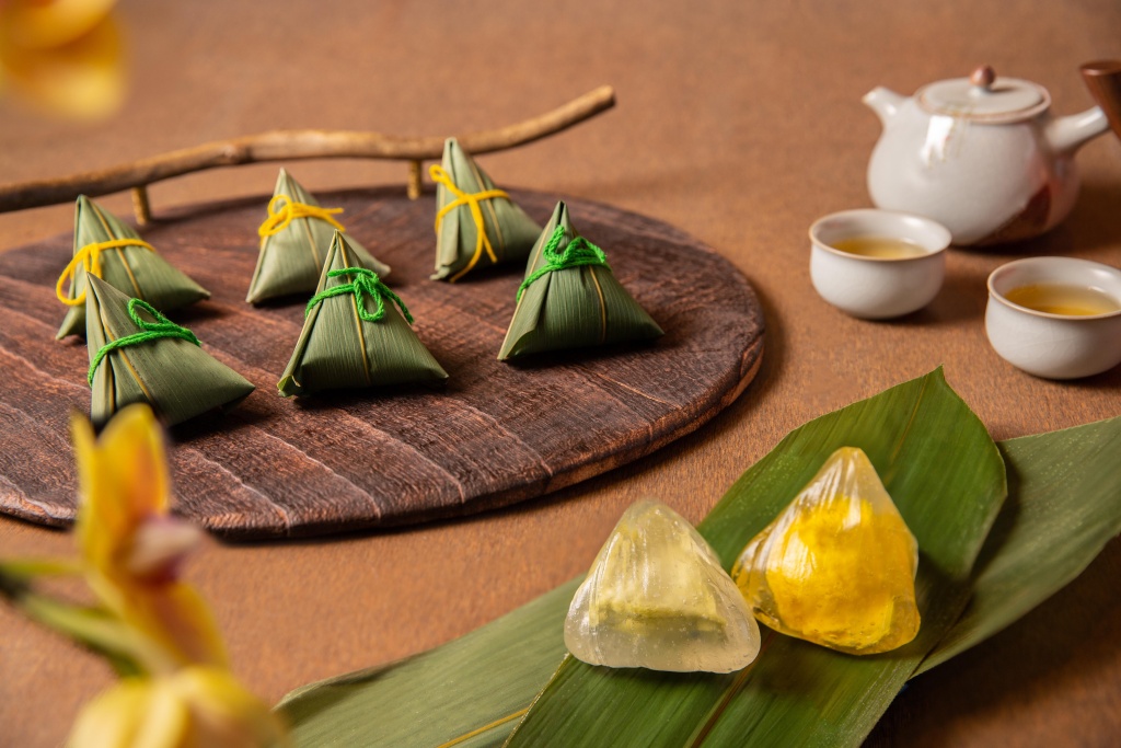 今年台北萬豪特別精選采采食茶CHA CHA THÉ純手工人氣冰心甜粽禮,晶瑩剔透、Q軟具嚼勁水晶外皮搭配特製內餡,軟Q冰心「茶香青梅粽」以文山包種茶入味的卡士達醬搭配青梅凍,充滿細緻茶香與酸甜清爽的青梅滋味,消暑新滋味。