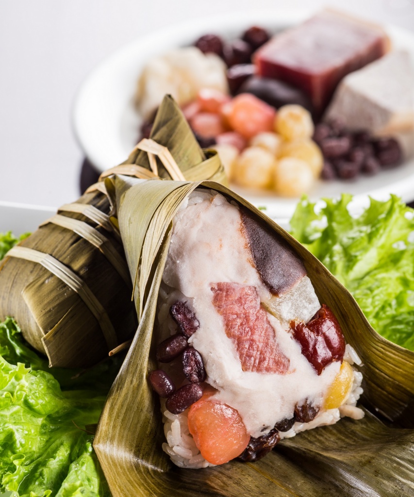 以頂級燕窩入饌的甜粽「燕窩豆沙粽」採用港式鹼水粽的做法,先將糯米洗淨後浸泡,再加入鹼粉攪拌均勻,使糯米「鹼糊化」並產生黏彈性,再以風乾竹葉包裹餡料,接著入水煮約5個小時而成,入口甜而不膩、滑順濃郁,為饕客帶來了全新的創意。